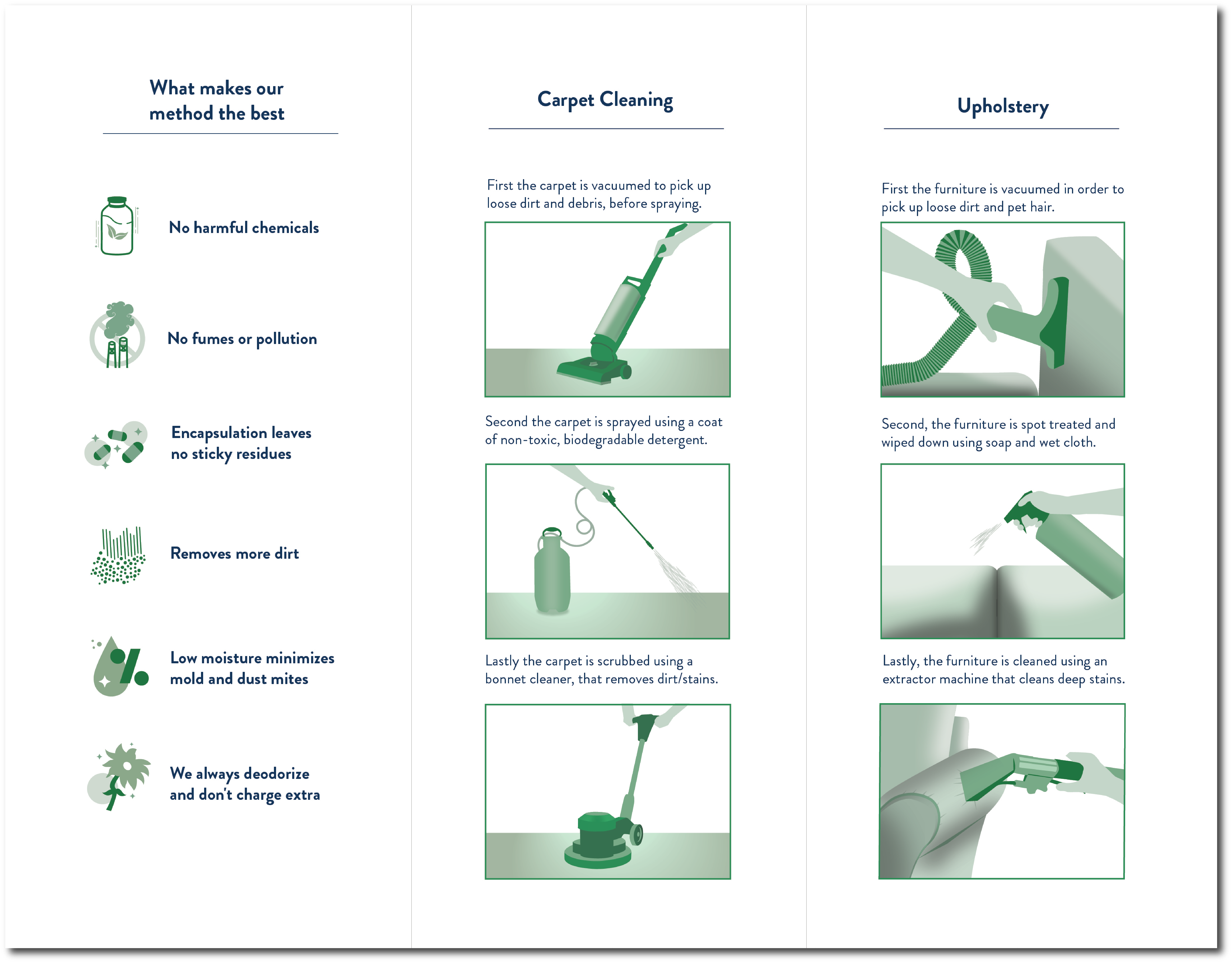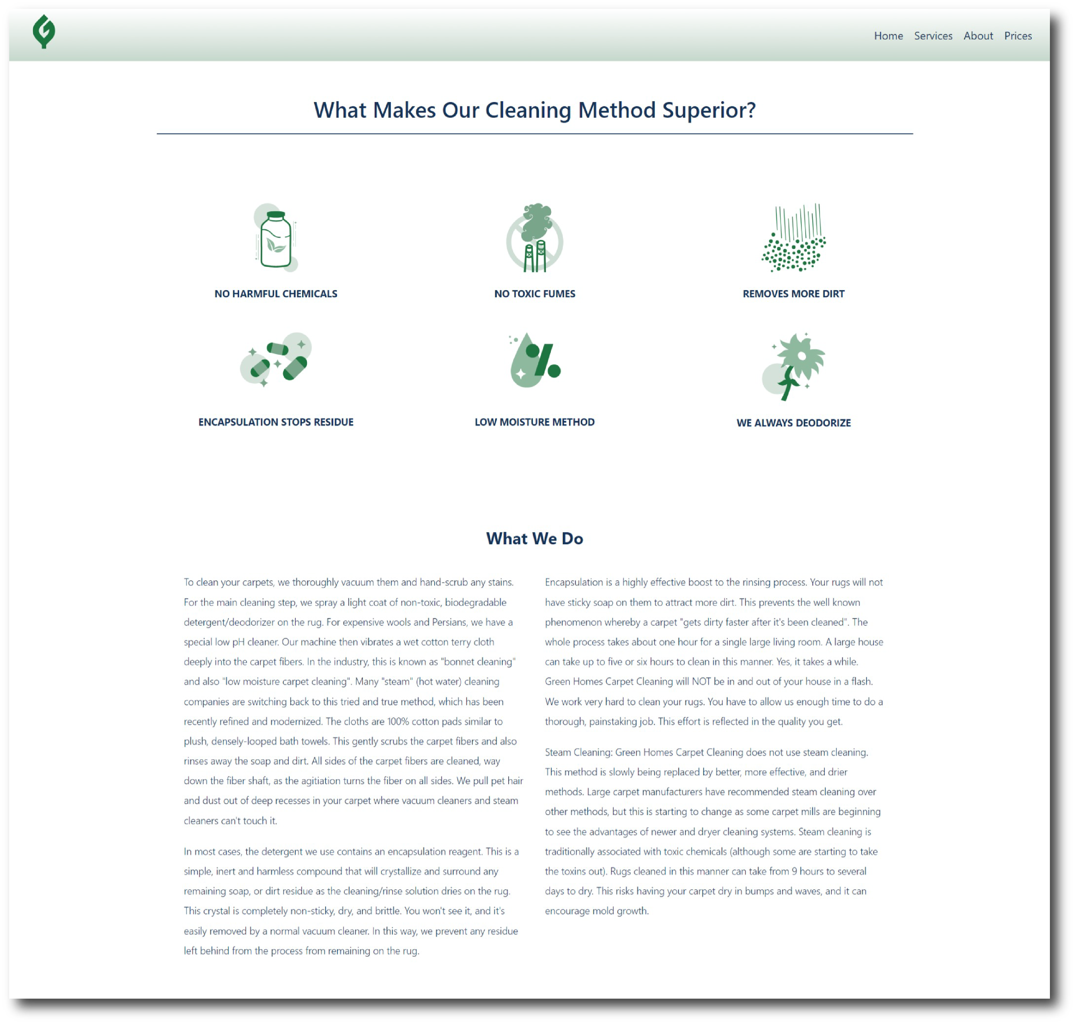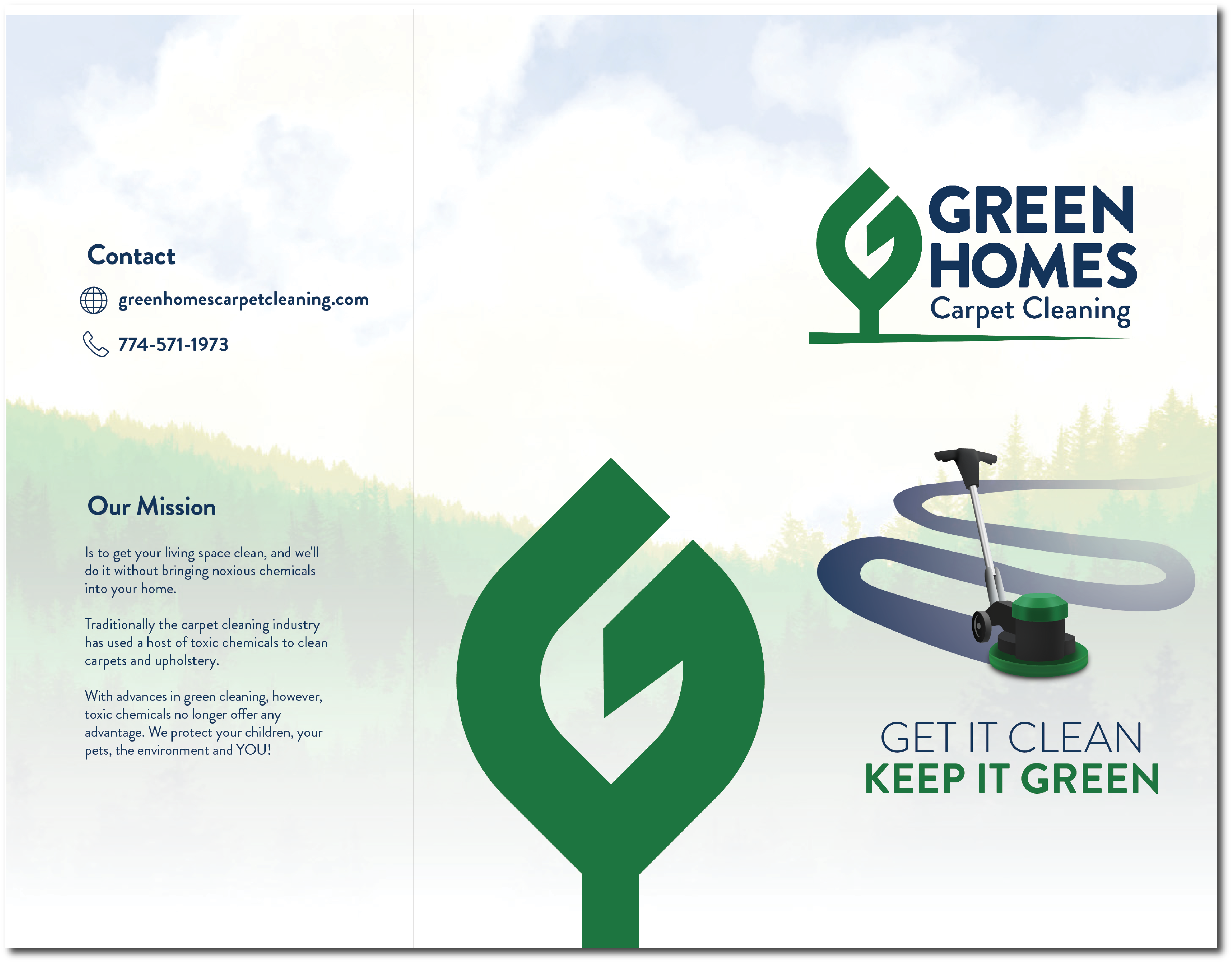 Green Homes Carpet Cleaning is a small family owned carpet cleaning business that was in need of a branding update. My goal was to create a new brand identity to serve the business including a range of deliverables that could be used to promote its services. The focus of the brand is on green non-toxic cleaning and I updated it to more heavily emphasize this aspect of the business and also to use the brand to raise awareness of the benefits of using non-toxic cleaners.
