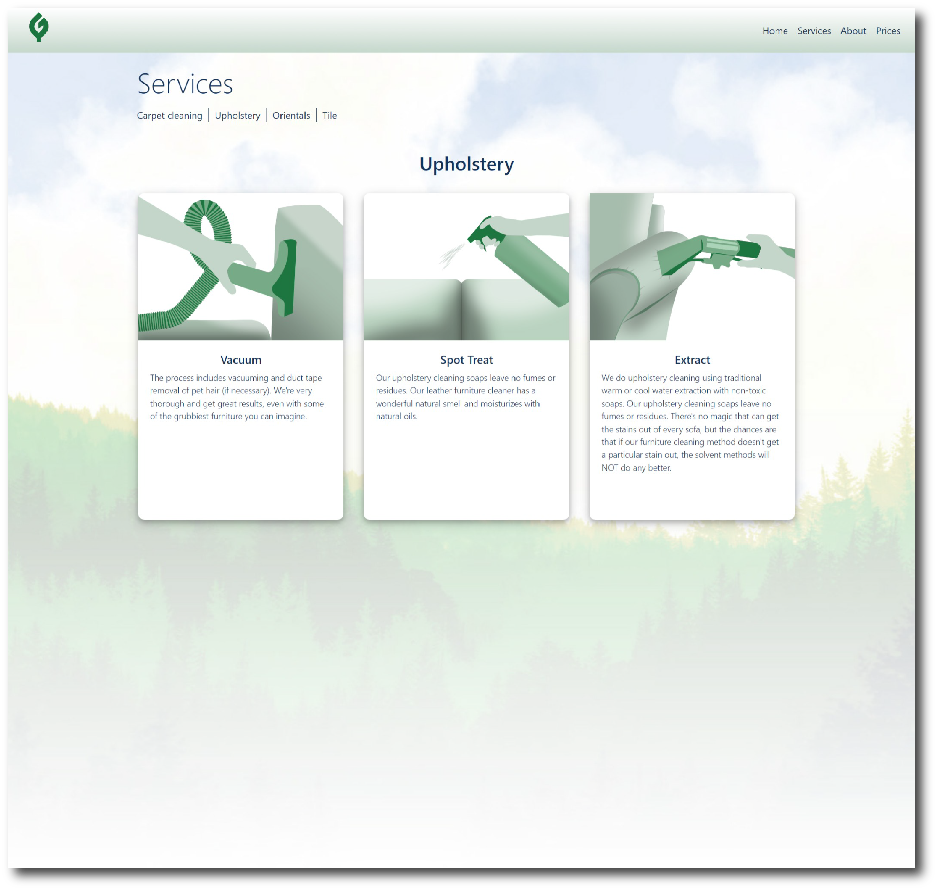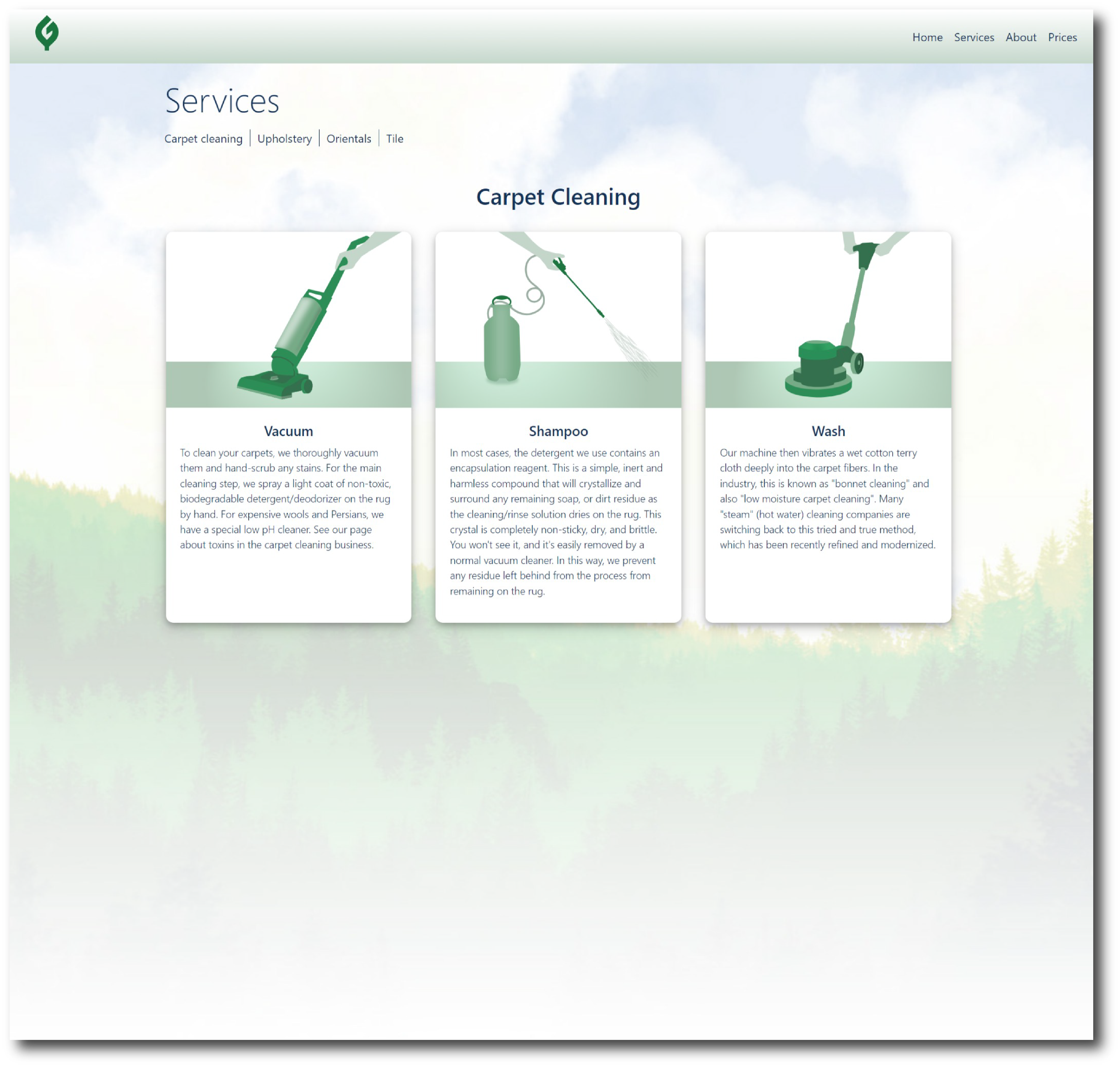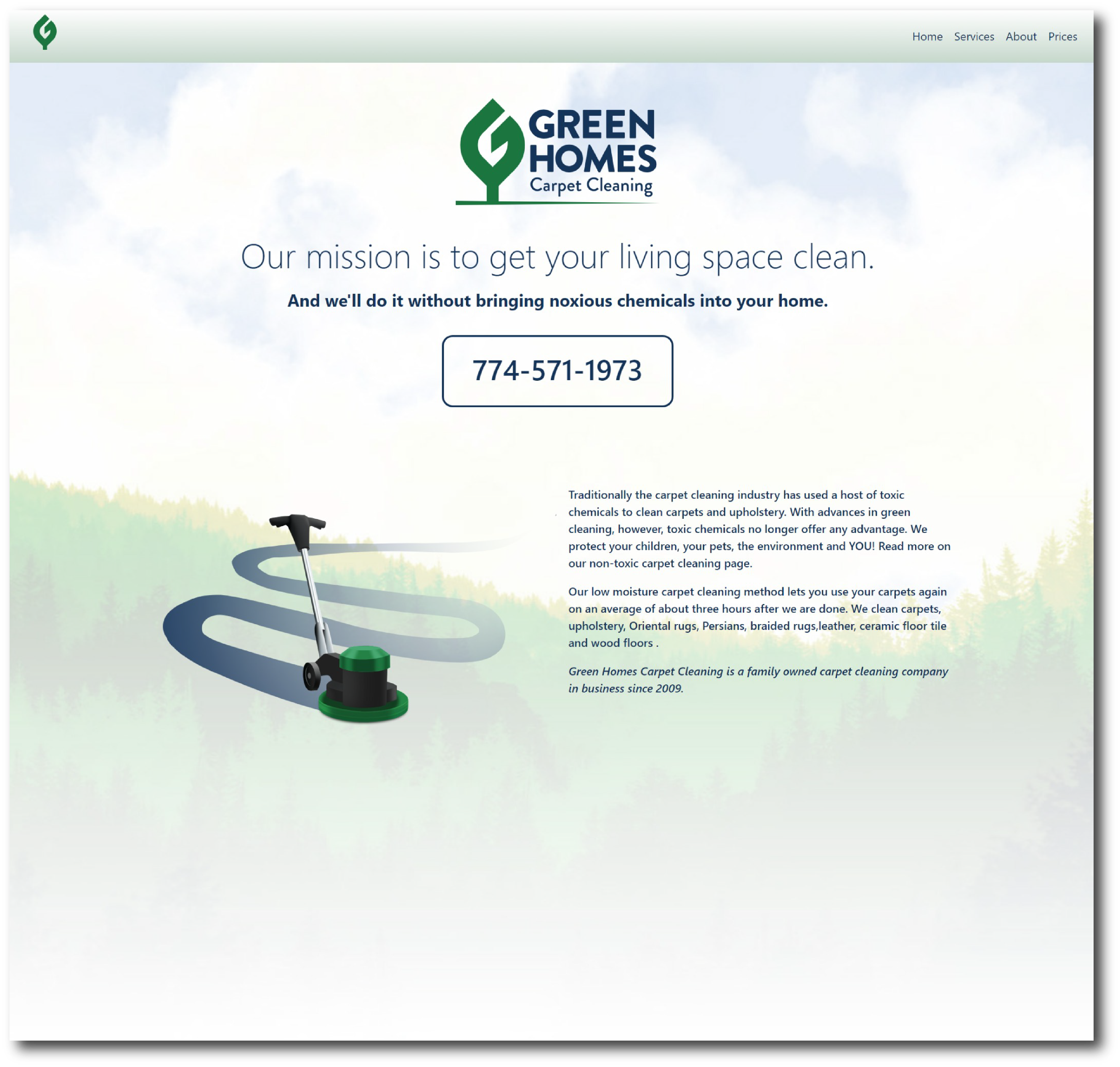 Green Homes Carpet Cleaning is a small family owned carpet cleaning business that was in need of a branding update. My goal was to create a new brand identity to serve the business including a range of deliverables that could be used to promote its services. The focus of the brand is on green non-toxic cleaning and I updated it to more heavily emphasize this aspect of the business and also to use the brand to raise awareness of the benefits of using non-toxic cleaners.