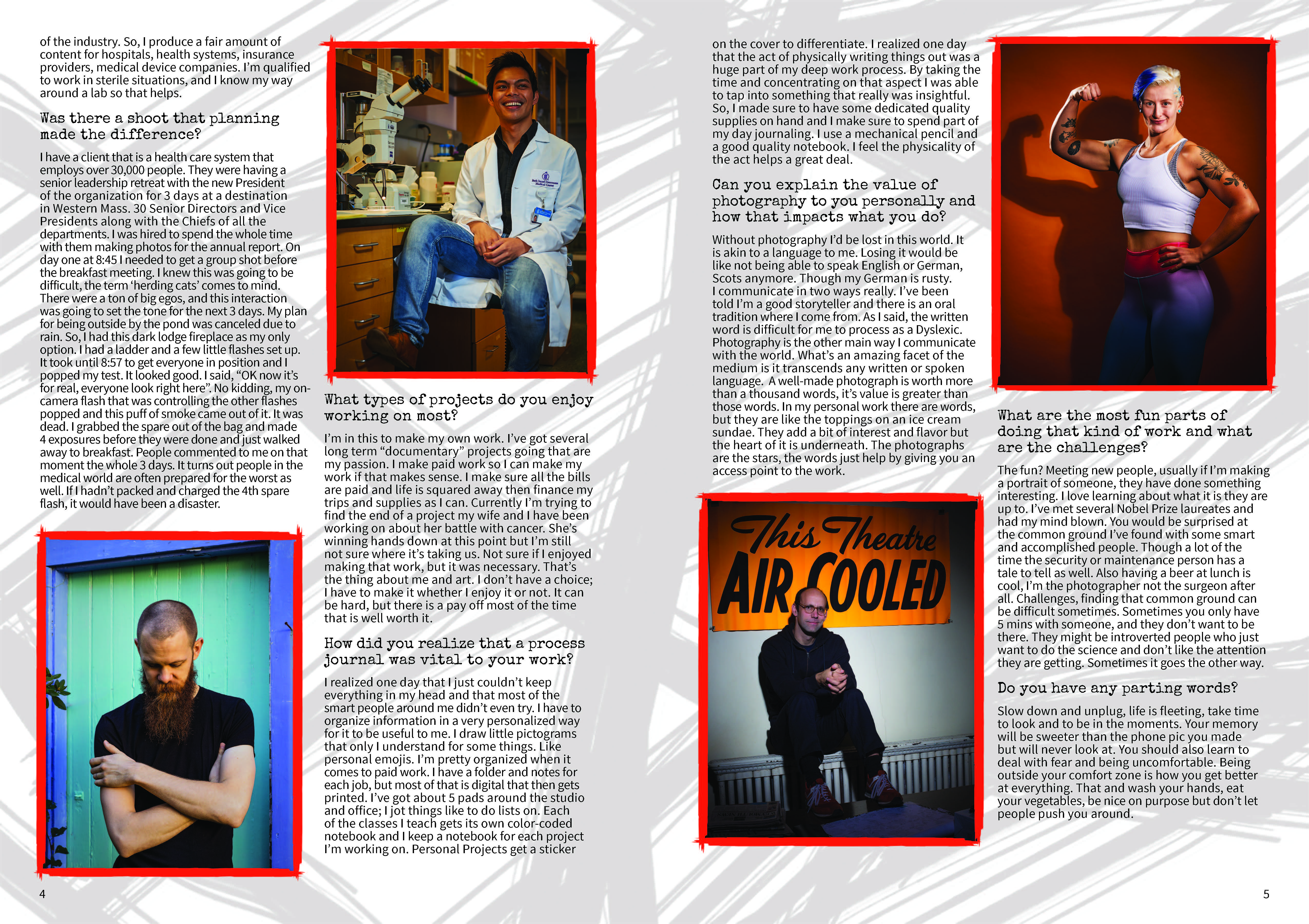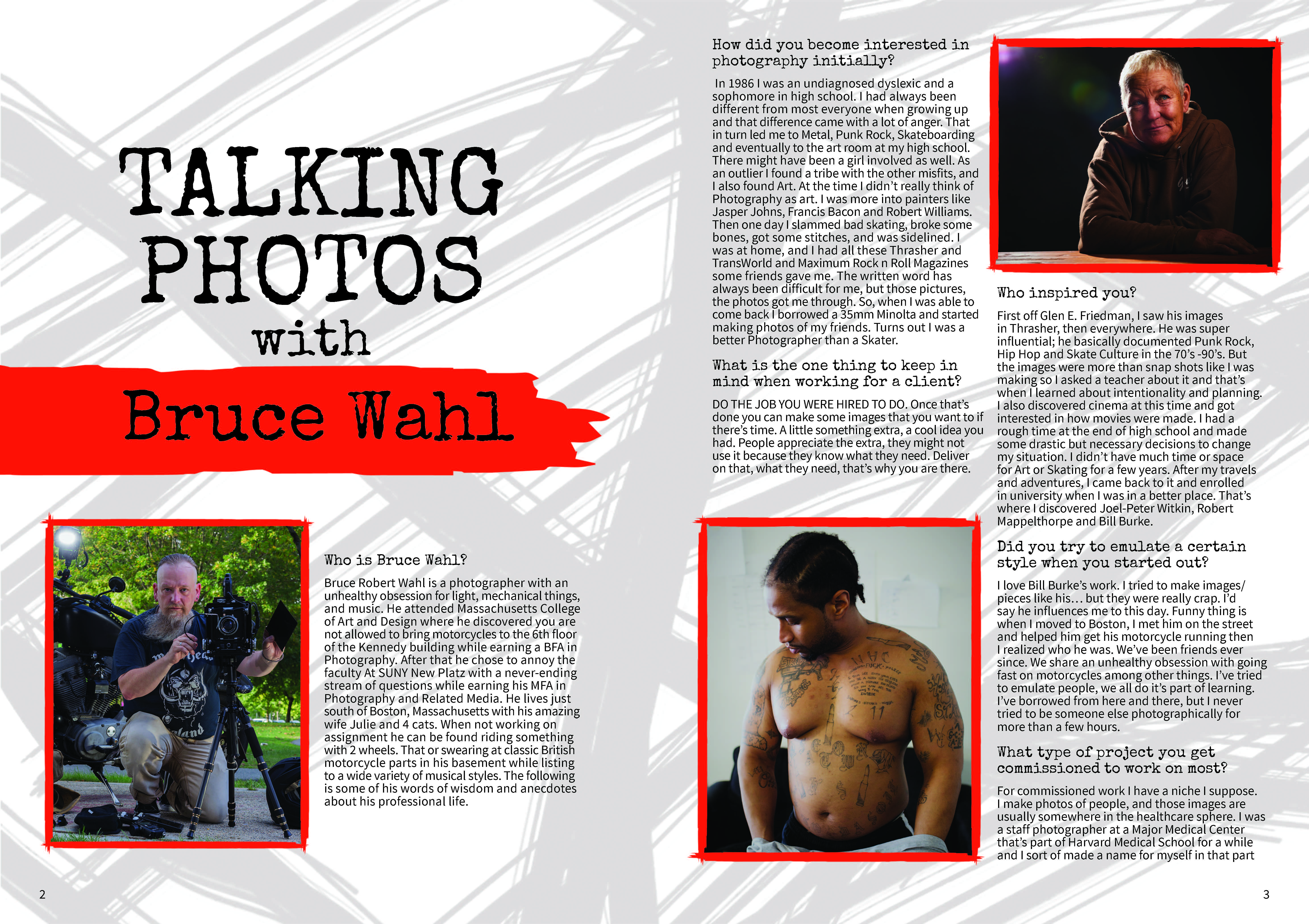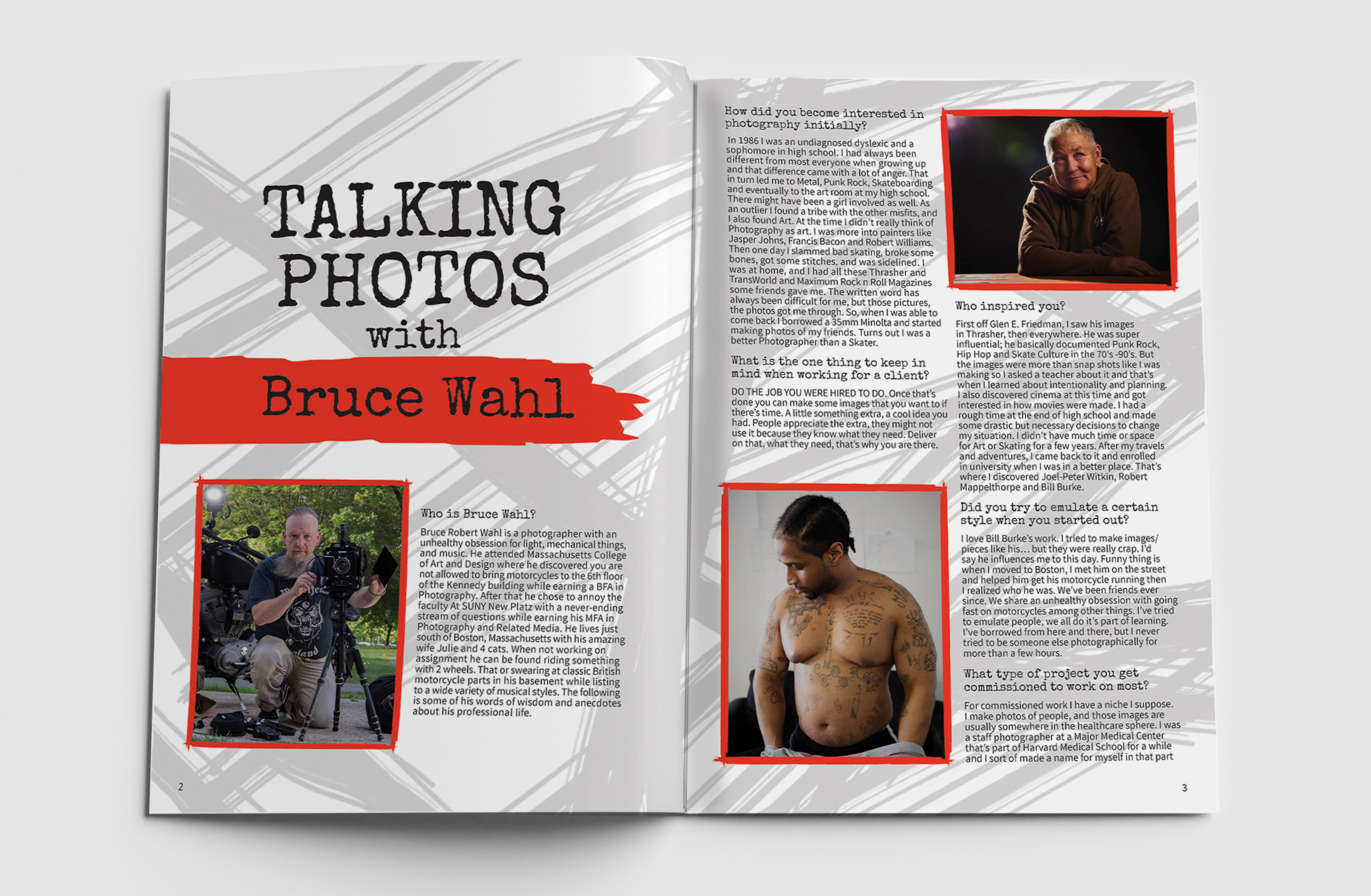 These spreads for TARNISHED Magazine present the work of the photographer being interviewed for the article. An effort was made to create a unified presentation of all the photos without distorting or editing the originals too much. Some small crops were made for the sake of presenting the photos at a similiar size and to fit in alignment with the text. Additionally, attention was given to the rag by adjusting the tracking on each line of text individually.
